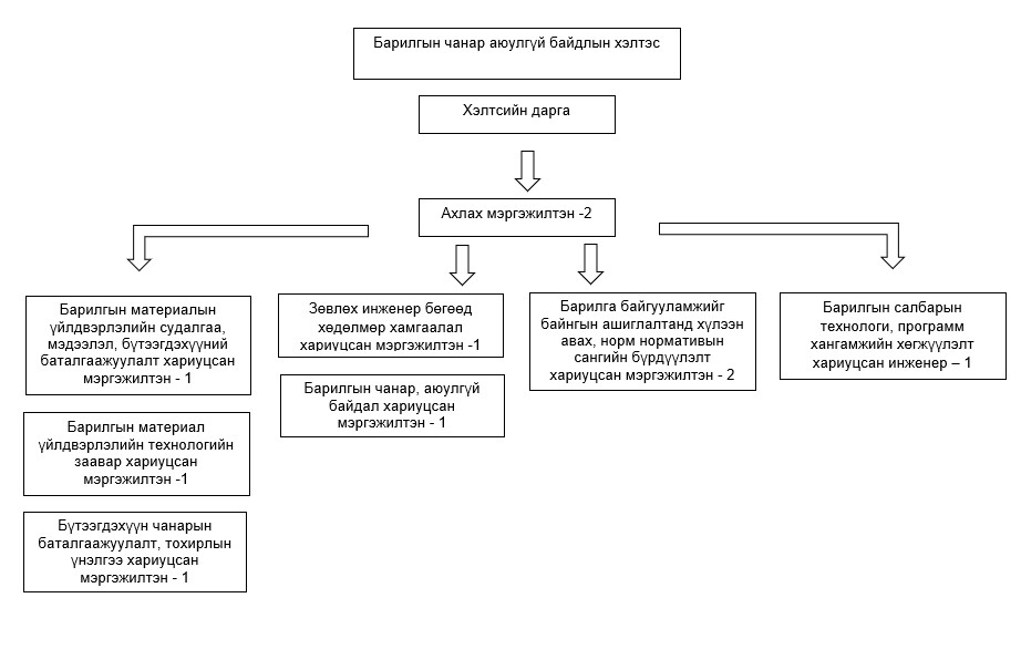 Барилга, барилгын материал үйлдвэрлэлийн салбарын хууль тогтоомж, урт болон дунд хугацааны бодлого, төсөл хөтөлбөрийг хэрэгжүүлэх, барилгын чанар аюулгүй байдал, паспортжуулалт, бүтээгдэхүүний баталгаажуулалтын үйл ажиллагааг зохион байгуулах, барилгын материалын технологийн заавар хянаж, бүртгэх, салбарын хөдөлмөрийн аюулгүй байдал, барилгын салбарын нэгдсэн мэдээллийн системийн үйл ажиллагаа, зөвлөх үйлчилгээ, норм нормативын сангийн бүрдүүлэлт хариуцах